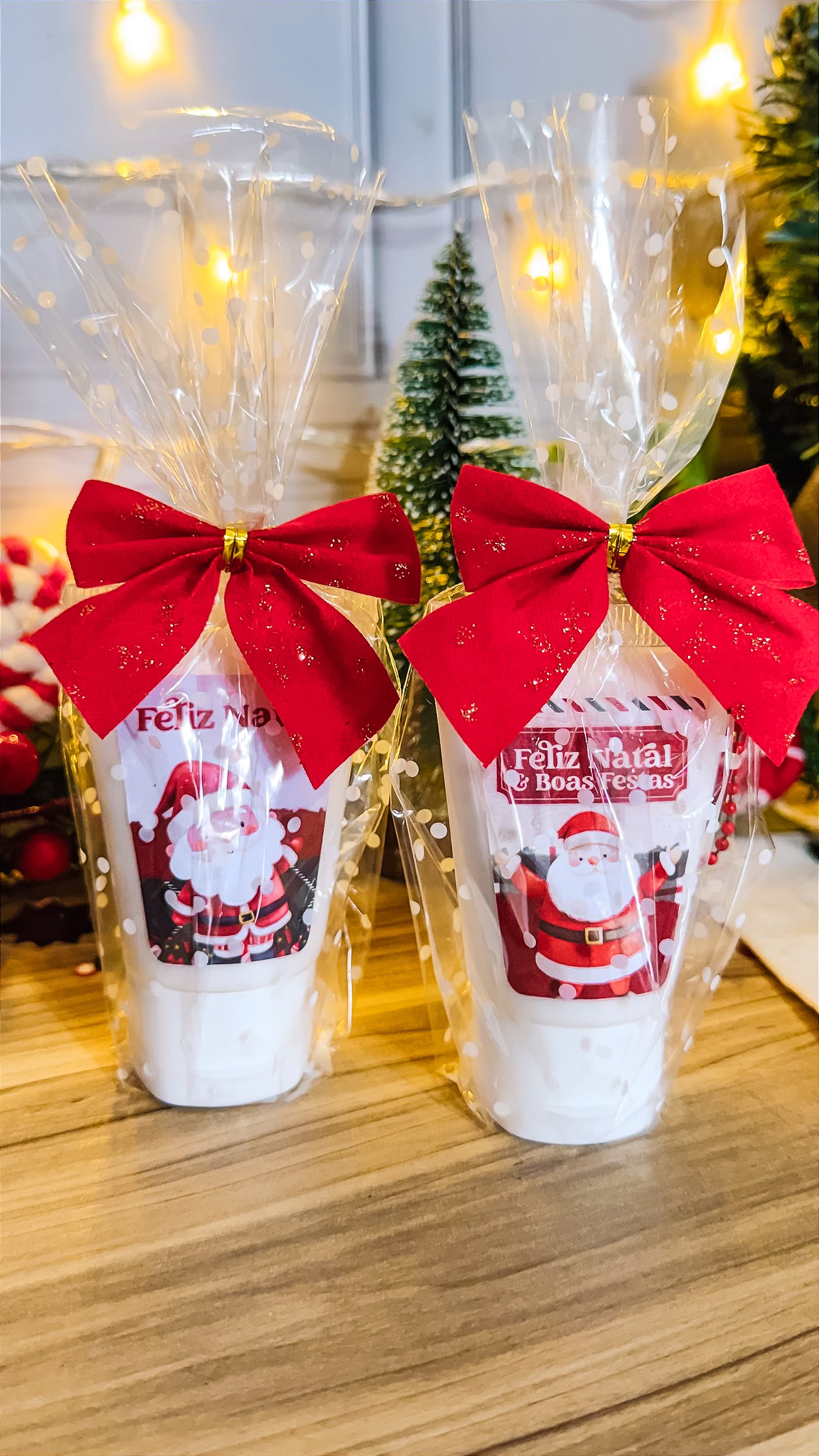 Nosso hidratante corporal natalino vem em embalagem personalizada com arte exclusiva do Papai Noel e laço de cetim, pronto pra presentear.